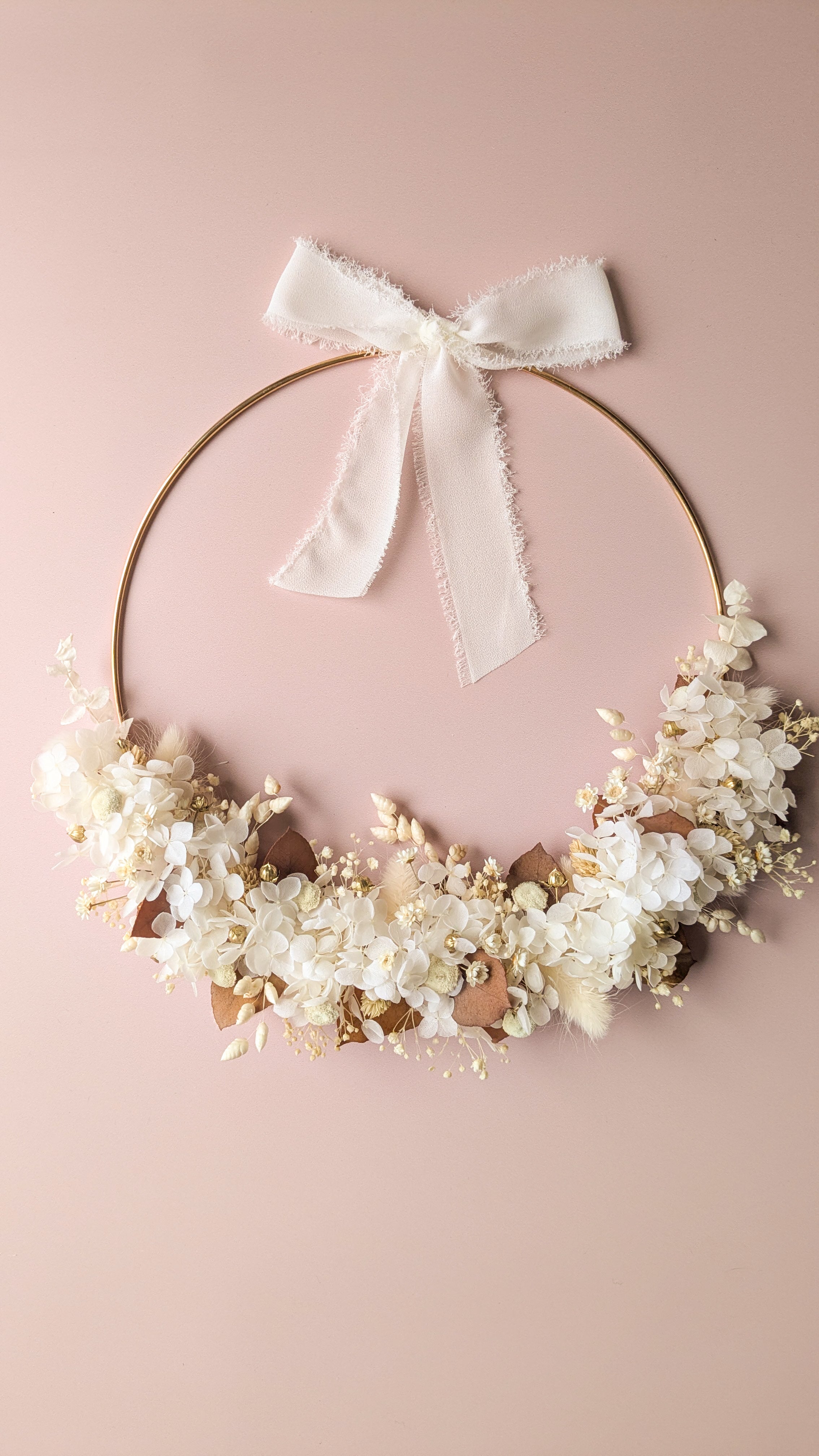Tambour brodé et fleurs séchées cœur doré à la main