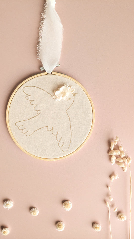 Tambour brodé et fleurs séchées cœur doré à la main