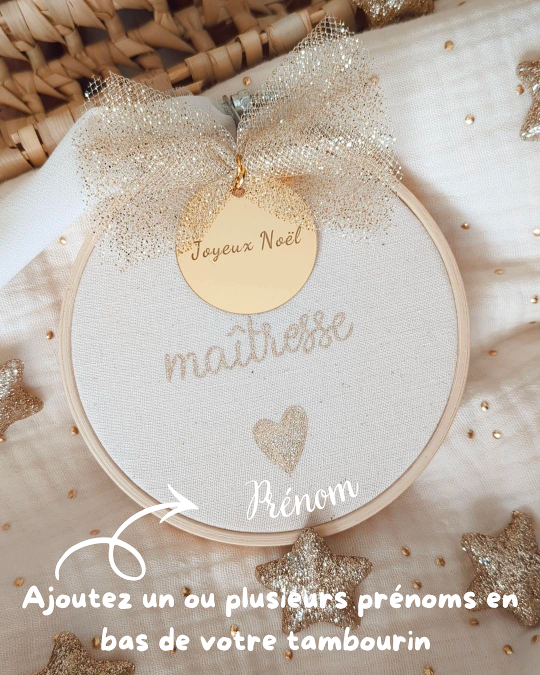 Ce modèle est vendu avec un noeud en tulle pailleté doré, un médaillon doré "Joyeux Noël", ainsi qu'un ruban en mousseline écrue pour suspendre votre tambourin.